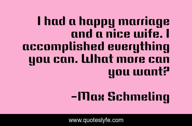 This page presents the quote "I had a happy marriage and a nice wife. I accomplished everything you can. What more can you want?". Author of this quote is Max Schmeling. This quote is about happy, nice, wife,.