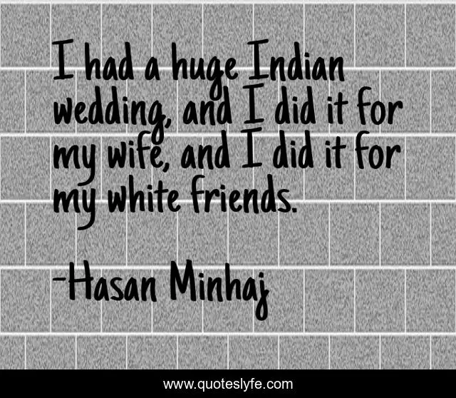 This page presents the quote "I had a huge Indian wedding, and I did it for my wife, and I did it for my white friends.". Author of this quote is Hasan Minhaj. This quote is about white, friends, wife,.