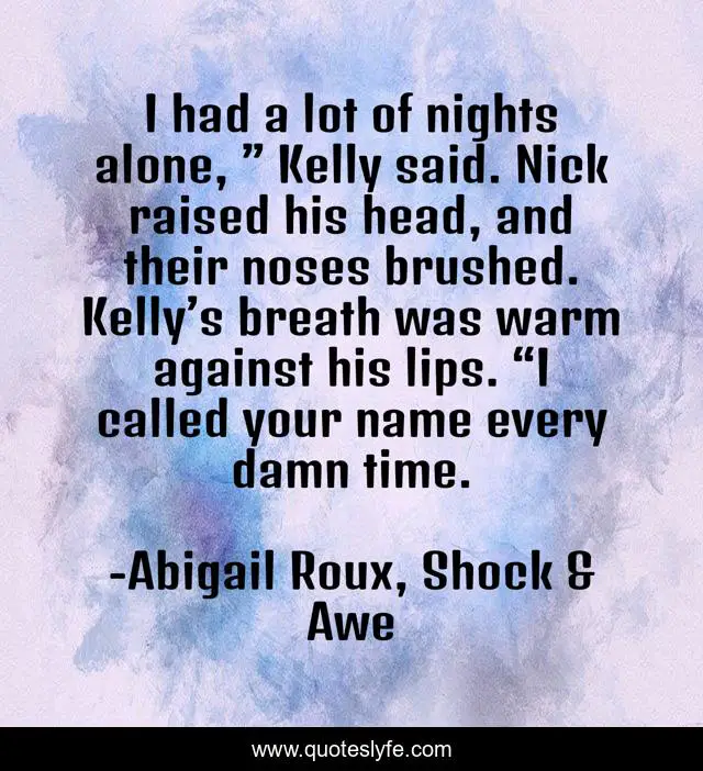 This page presents the quote "I had a lot of nights alone, ” Kelly said. Nick raised his head, and their noses brushed. Kelly’s breath was warm against his lips. “I called your name every damn time.". Author of this quote is Abigail Roux, Shock & Awe. This quote is about erotica, nick-o-flaherty, kelly-abbott,.