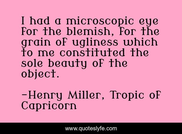 This page presents the quote "I had a microscopic eye for the blemish, for the grain of ugliness which to me constituted the sole beauty of the object.". Author of this quote is Henry Miller, Tropic of Capricorn. This quote is about esthetics, philosophy,.