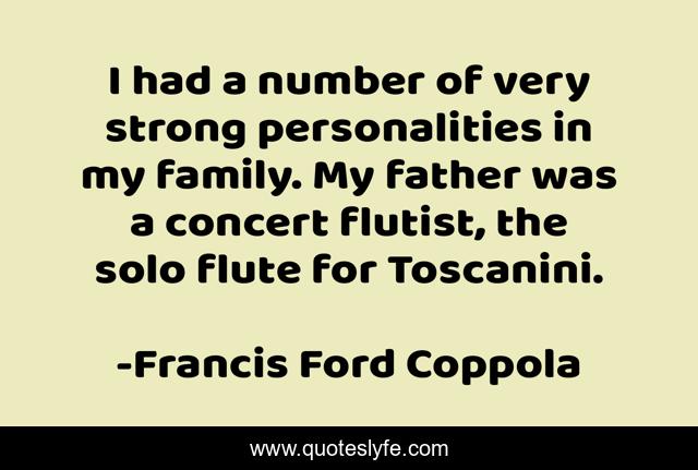 This page presents the quote "I had a number of very strong personalities in my family. My father was a concert flutist, the solo flute for Toscanini.". Author of this quote is Francis Ford Coppola. This quote is about strong, father, concert,.