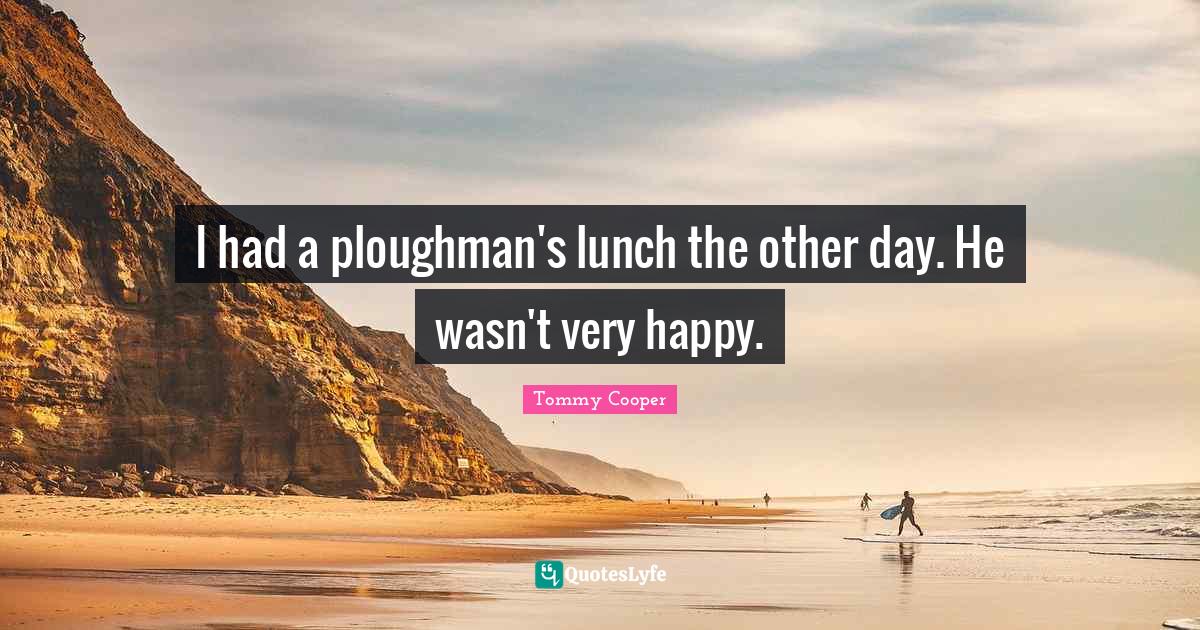 This page presents the quote "I had a ploughman's lunch the other day. He wasn't very happy.". Author of this quote is Tommy Cooper. This quote is about lunch, funny, very happy, humor,.