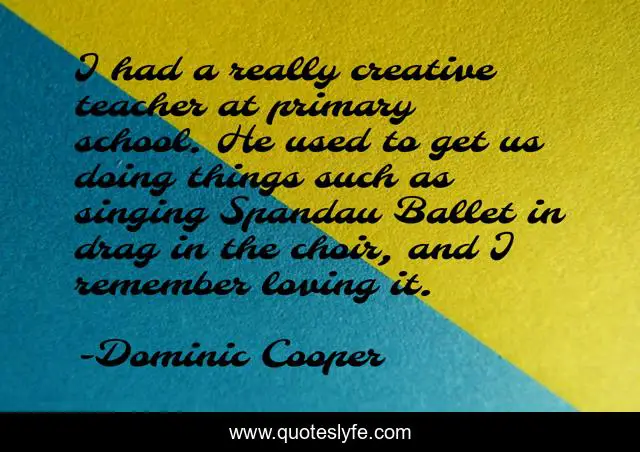 This page presents the quote "I had a really creative teacher at primary school. He used to get us doing things such as singing Spandau Ballet in drag in the choir, and I remember loving it.". Author of this quote is Dominic Cooper. This quote is about school, remember, creative,.