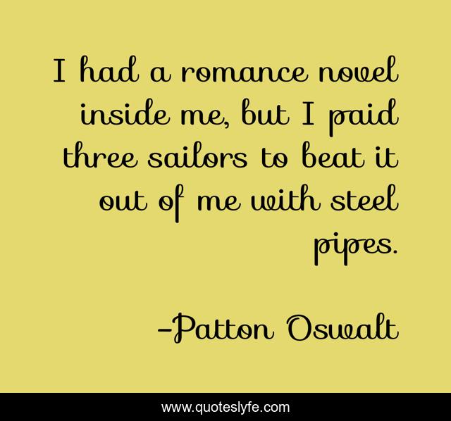 This page presents the quote "I had a romance novel inside me, but I paid three sailors to beat it out of me with steel pipes.". Author of this quote is Patton Oswalt. This quote is about humor, sailors, gender, violence, writing, romance, femininity, masculinity, romance-novels,.