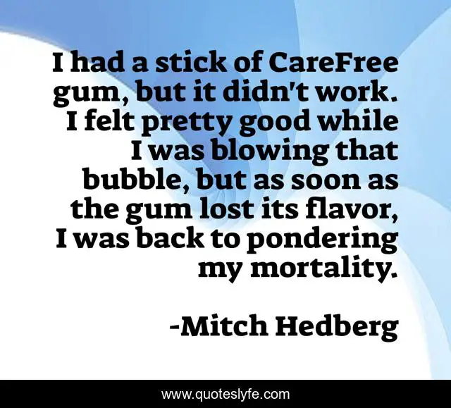 This page presents the quote "I had a stick of CareFree gum, but it didn't work. I felt pretty good while I was blowing that bubble, but as soon as the gum lost its flavor, I was back to pondering my mortality.". Author of this quote is Mitch Hedberg. This quote is about good, back, lost,.