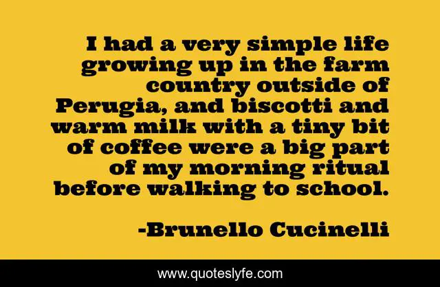 This page presents the quote "I had a very simple life growing up in the farm country outside of Perugia, and biscotti and warm milk with a tiny bit of coffee were a big part of my morning ritual before walking to school.". Author of this quote is Brunello Cucinelli. This quote is about life, coffee, school,.