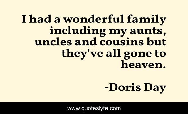 This page presents the quote "I had a wonderful family including my aunts, uncles and cousins but they've all gone to heaven.". Author of this quote is Doris Day. This quote is about cousins, wonderful, heaven,.