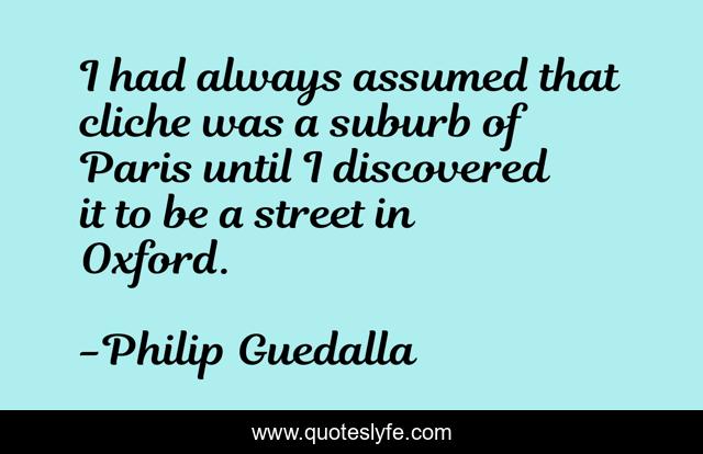 This page presents the quote "I had always assumed that cliche was a suburb of Paris until I discovered it to be a street in Oxford.". Author of this quote is Philip Guedalla. This quote is about quips, comments,.