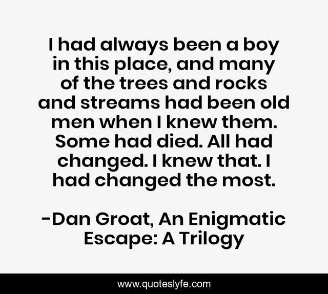 This page presents the quote "I had always been a boy in this place, and many of the trees and rocks and streams had been old men when I knew them. Some had died. All had changed. I knew that. I had changed the most.". Author of this quote is Dan Groat, An Enigmatic Escape: A Trilogy. This quote is about boy, boyhood, youthfulness, youth, boys, change, changes, youthful,.