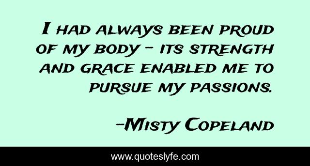 This page presents the quote "I had always been proud of my body - its strength and grace enabled me to pursue my passions.". Author of this quote is Misty Copeland. This quote is about me, proud, grace,.