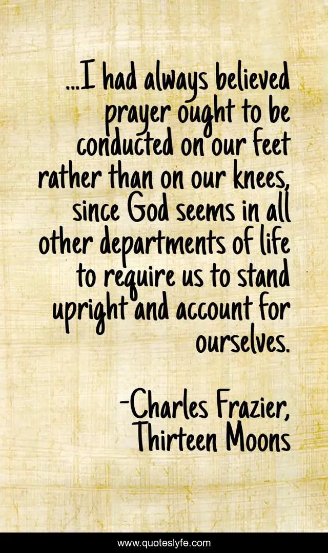 This page presents the quote "...I had always believed prayer ought to be conducted on our feet rather than on our knees, since God seems in all other departments of life to require us to stand upright and account for ourselves.". Author of this quote is Charles Frazier, Thirteen Moons. .