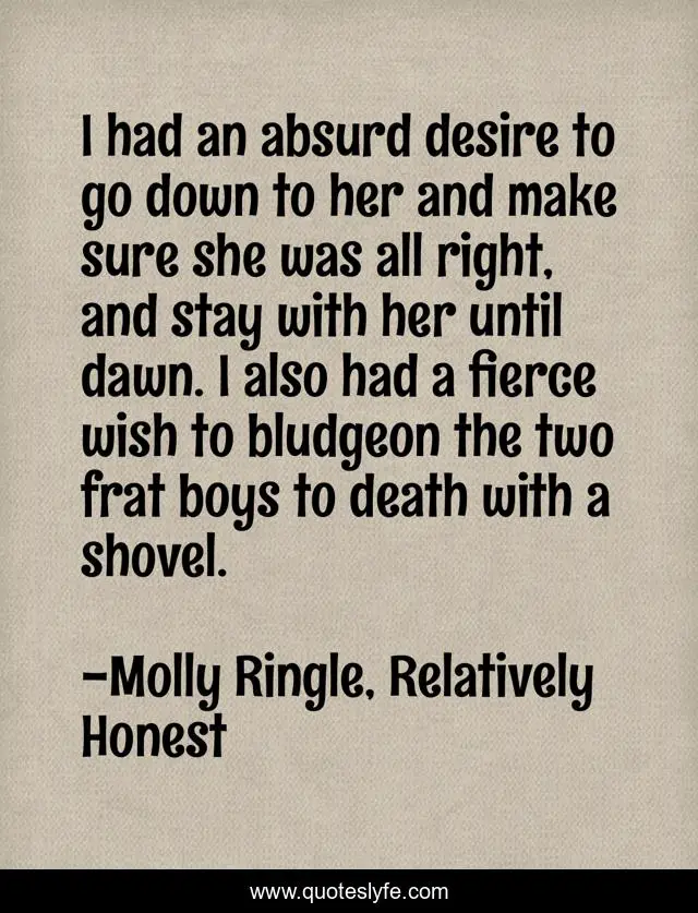 This page presents the quote "I had an absurd desire to go down to her and make sure she was all right, and stay with her until dawn. I also had a fierce wish to bludgeon the two frat boys to death with a shovel.". Author of this quote is Molly Ringle, Relatively Honest. This quote is about relationships, college, love, affection,.