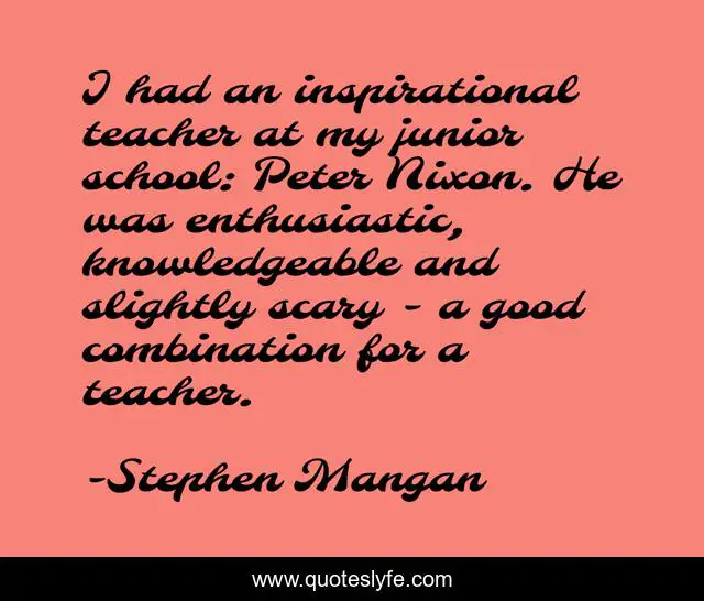 This page presents the quote "I had an inspirational teacher at my junior school: Peter Nixon. He was enthusiastic, knowledgeable and slightly scary - a good combination for a teacher.". Author of this quote is Stephen Mangan. This quote is about school, good, teacher,.