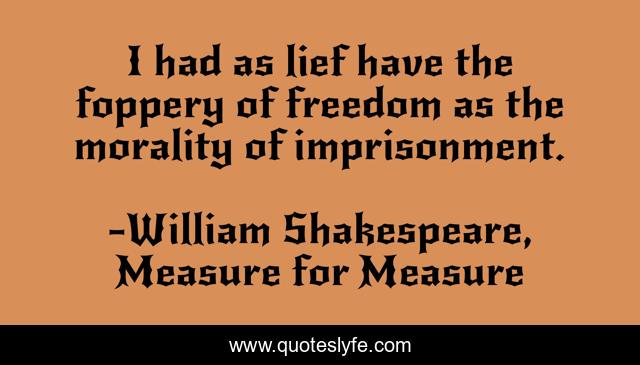 This page presents the quote "I had as lief have the foppery of freedom as the morality of imprisonment.". Author of this quote is William Shakespeare, Measure for Measure. This quote is about fredom, law, morality, prison,.