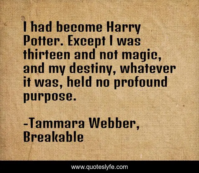 This page presents the quote "I had become Harry Potter. Except I was thirteen and not magic, and my destiny, whatever it was, held no profound purpose.". Author of this quote is Tammara Webber, Breakable. This quote is about breakable, contours-of-the-heart, landon-maxfield, harry-potter,.