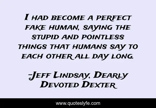 This page presents the quote "I had become a perfect fake human, saying the stupid and pointless things that humans say to each other all day long.". Author of this quote is Jeff Lindsay, Dearly Devoted Dexter. This quote is about stupid, pointless, human,.