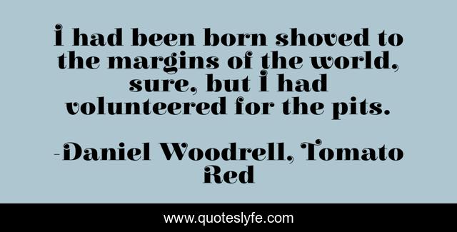 This page presents the quote "I had been born shoved to the margins of the world, sure, but I had volunteered for the pits.". Author of this quote is Daniel Woodrell, Tomato Red. This quote is about depression, hillbilly-noir, self-knowledge,.