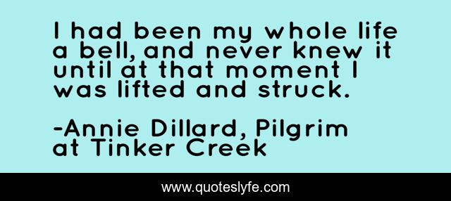 This page presents the quote "I had been my whole life a bell, and never knew it until at that moment I was lifted and struck.". Author of this quote is Annie Dillard, Pilgrim at Tinker Creek. .