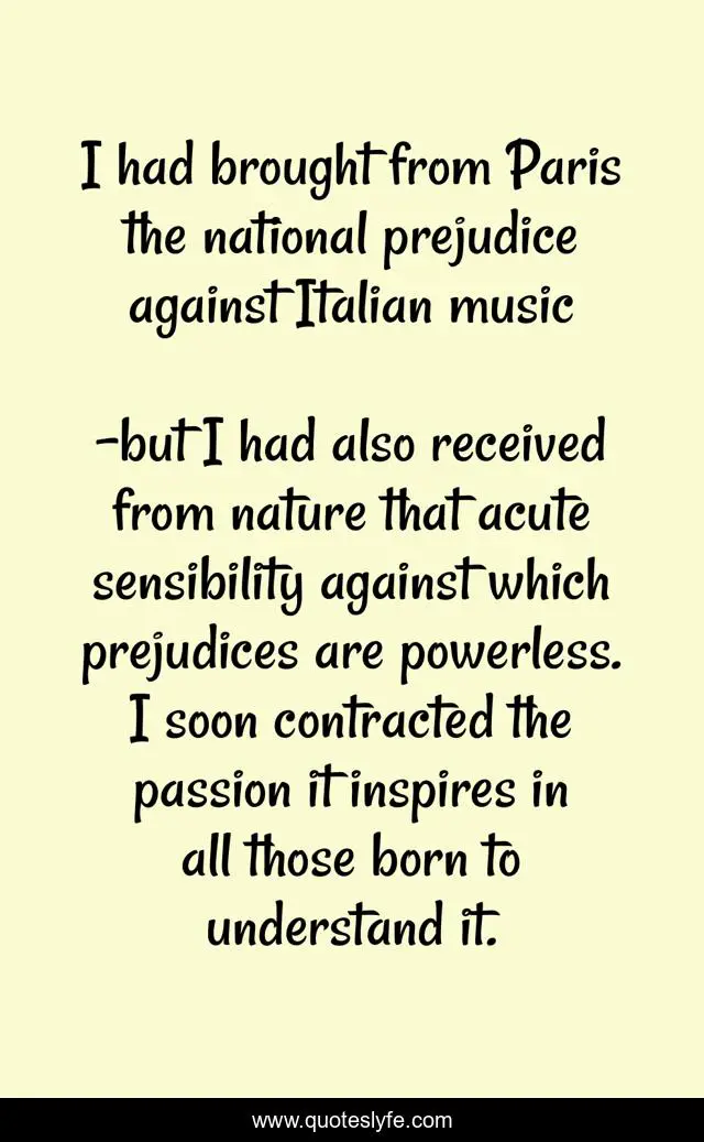 "but I had also received from nature that acute sensibility against which prejudices are powerless. I soon contracted the passion it inspires in all those born to understand it. Quotes." Quoteslyfe.com, 2025. Mon. 08 Dec. 2025. <https://www.quoteslyfe.com/quote/I-had-brought-from-Paris-the-national-160795>.
