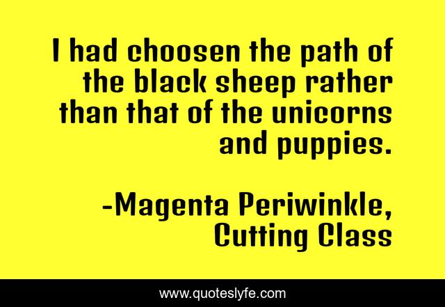 This page presents the quote "I had choosen the path of the black sheep rather than that of the unicorns and puppies.". Author of this quote is Magenta Periwinkle, Cutting Class. This quote is about teen, goth, abnormal, punk, teenagers, teen-angst, weirdo, cutting-class, popular-kids,.