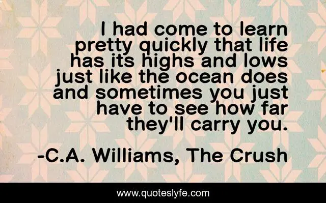 This page presents the quote "I had come to learn pretty quickly that life has its highs and lows just like the ocean does and sometimes you just have to see how far they'll carry you.". Author of this quote is C.A. Williams, The Crush. This quote is about wynn, life-lessons, ocean,.