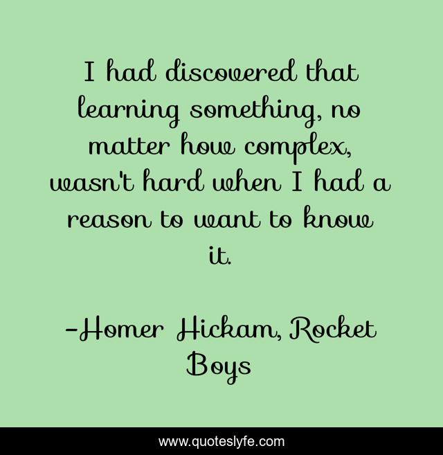 This page presents the quote "I had discovered that learning something, no matter how complex, wasn't hard when I had a reason to want to know it.". Author of this quote is Homer Hickam, Rocket Boys. This quote is about rocket-boys, october-sky, curiosity, complex, determination, learning, homer-hickam,.