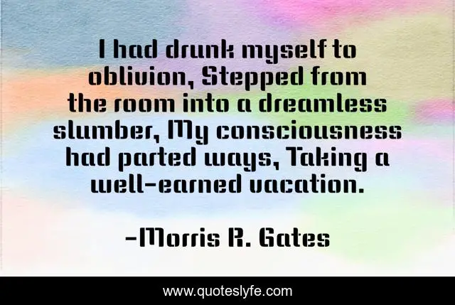 This page presents the quote "I had drunk myself to oblivion, Stepped from the room into a dreamless slumber, My consciousness had parted ways, Taking a well-earned vacation.". Author of this quote is Morris R. Gates. This quote is about alcohol, drugs, escapism, binge, escape, drinking, drinking-alcohol, binge-drinking, addiction,.