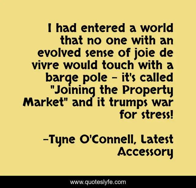 This page presents the quote "I had entered a world that no one with an evolved sense of joie de vivre would touch with a barge pole - it's called "Joining the Property Market" and it trumps war for stress!". Author of this quote is Tyne O'Connell, Latest Accessory. This quote is about estate-agents, property-market, stress, stressed,.