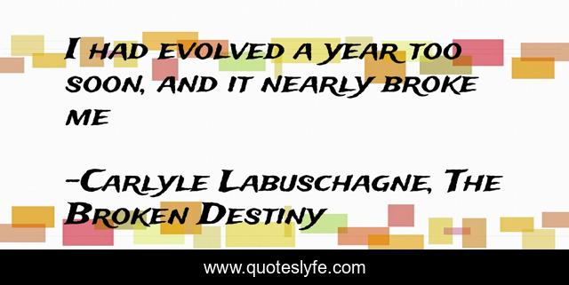 This page presents the quote "I had evolved a year too soon, and it nearly broke me". Author of this quote is Carlyle Labuschagne, The Broken Destiny. This quote is about hot-release, science-fiction, fiction, fantasy, new-release, dystopian-fiction, young-adult, the-broken-destiny,.