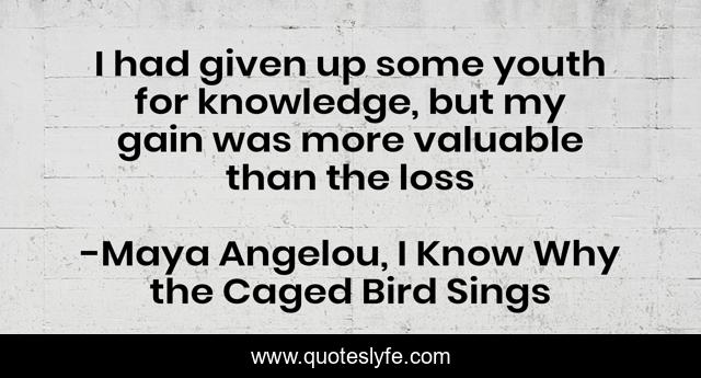 This page presents the quote "I had given up some youth for knowledge, but my gain was more valuable than the loss". Author of this quote is Maya Angelou, I Know Why the Caged Bird Sings. This quote is about youth, life, knowledge, wisdom,.