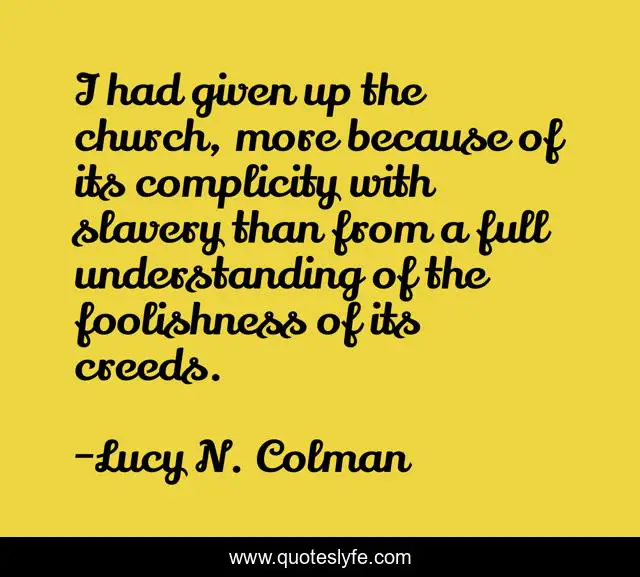 This page presents the quote "I had given up the church, more because of its complicity with slavery than from a full understanding of the foolishness of its creeds.". Author of this quote is Lucy N. Colman. This quote is about equality, belief, atheist, creed, slavery, foolishness,.