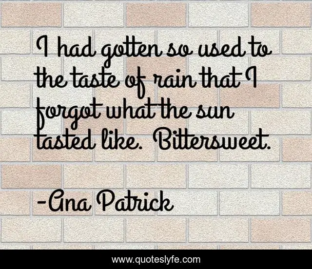 This page presents the quote "I had gotten so used to the taste of rain that I forgot what the sun tasted like. Bittersweet.". Author of this quote is Ana Patrick. This quote is about enthusiasm, juliette-monroe, inspirational, rain,.