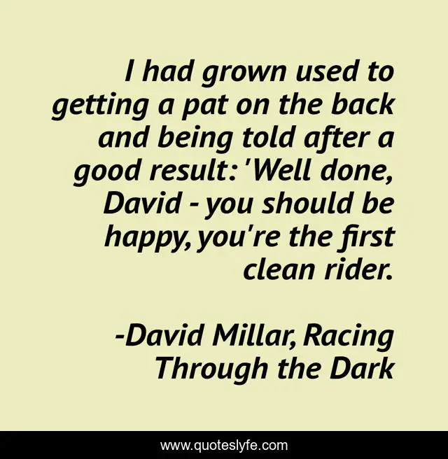 This page presents the quote "I had grown used to getting a pat on the back and being told after a good result: 'Well done, David - you should be happy, you're the first clean rider.". Author of this quote is David Millar, Racing Through the Dark. This quote is about purity, doping, clean, happiness, sports,.