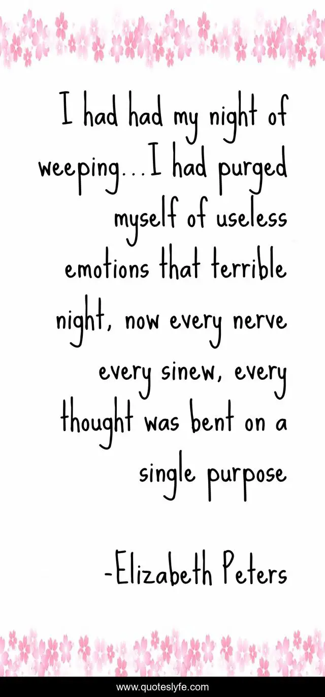 This page presents the quote "I had had my night of weeping...I had purged myself of useless emotions that terrible night, now every nerve every sinew, every thought was bent on a single purpose". Author of this quote is Elizabeth Peters. This quote is about grief, purpose, inspiration,.