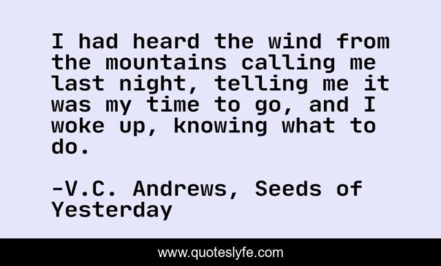 This page presents the quote "I had heard the wind from the mountains calling me last night, telling me it was my time to go, and I woke up, knowing what to do.". Author of this quote is V.C. Andrews, Seeds of Yesterday. This quote is about heartache, loss, incest, hearbreak, dying,.