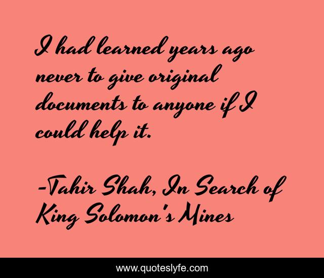 This page presents the quote "I had learned years ago never to give original documents to anyone if I could help it.". Author of this quote is Tahir Shah, In Search of King Solomon's Mines. This quote is about travel, documents,.