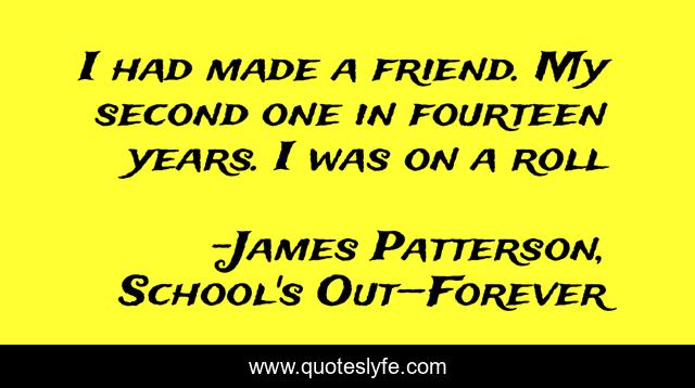 This page presents the quote "I had made a friend. My second one in fourteen years. I was on a roll". Author of this quote is James Patterson, School's Out—Forever. This quote is about max, irony, making-friend, unsocialized,.