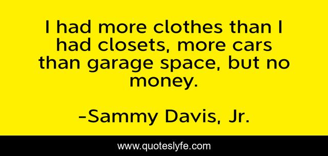 This page presents the quote "I had more clothes than I had closets, more cars than garage space, but no money.". Author of this quote is Sammy Davis, Jr.. This quote is about money, space, clothes,.