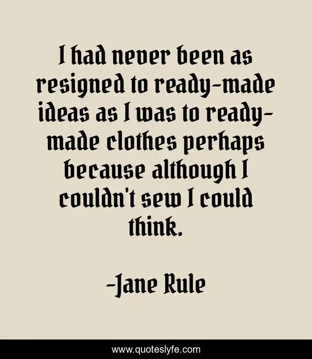 This page presents the quote "I had never been as resigned to ready-made ideas as I was to ready-made clothes perhaps because although I couldn't sew I could think.". Author of this quote is Jane Rule. This quote is about self, reliance,.