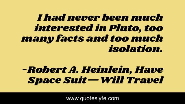This page presents the quote "I had never been much interested in Pluto, too many facts and too much isolation.". Author of this quote is Robert A. Heinlein, Have Space Suit—Will Travel. This quote is about motivation, integration, application, curiosity, openness, teaching,.