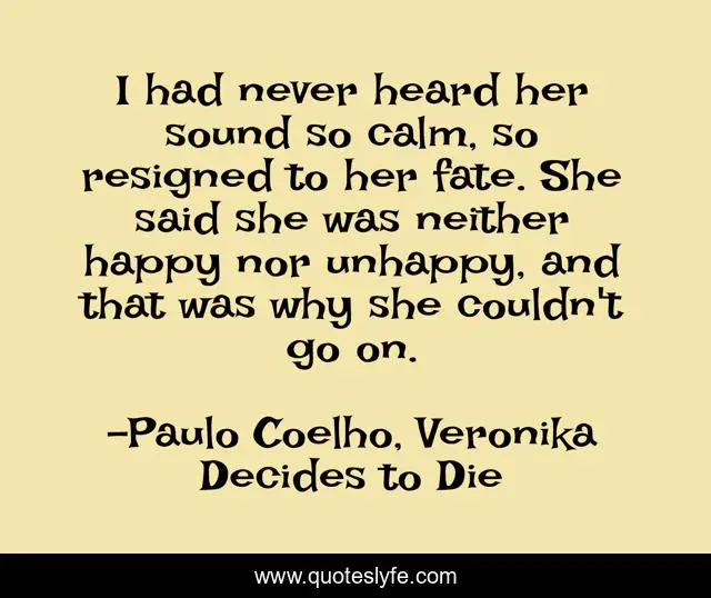 This page presents the quote "I had never heard her sound so calm, so resigned to her fate. She said she was neither happy nor unhappy, and that was why she couldn't go on.". Author of this quote is Paulo Coelho, Veronika Decides to Die. This quote is about depression, fate, unhappiness,.