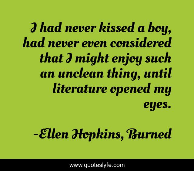 This page presents the quote "I had never kissed a boy, had never even considered that I might enjoy such an unclean thing, until literature opened my eyes.". Author of this quote is Ellen Hopkins, Burned. This quote is about boy, kissed, literature,.