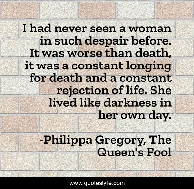 This page presents the quote "I had never seen a woman in such despair before. It was worse than death, it was a constant longing for death and a constant rejection of life. She lived like darkness in her own day.". Author of this quote is Philippa Gregory, The Queen's Fool. This quote is about despair, dejection,.