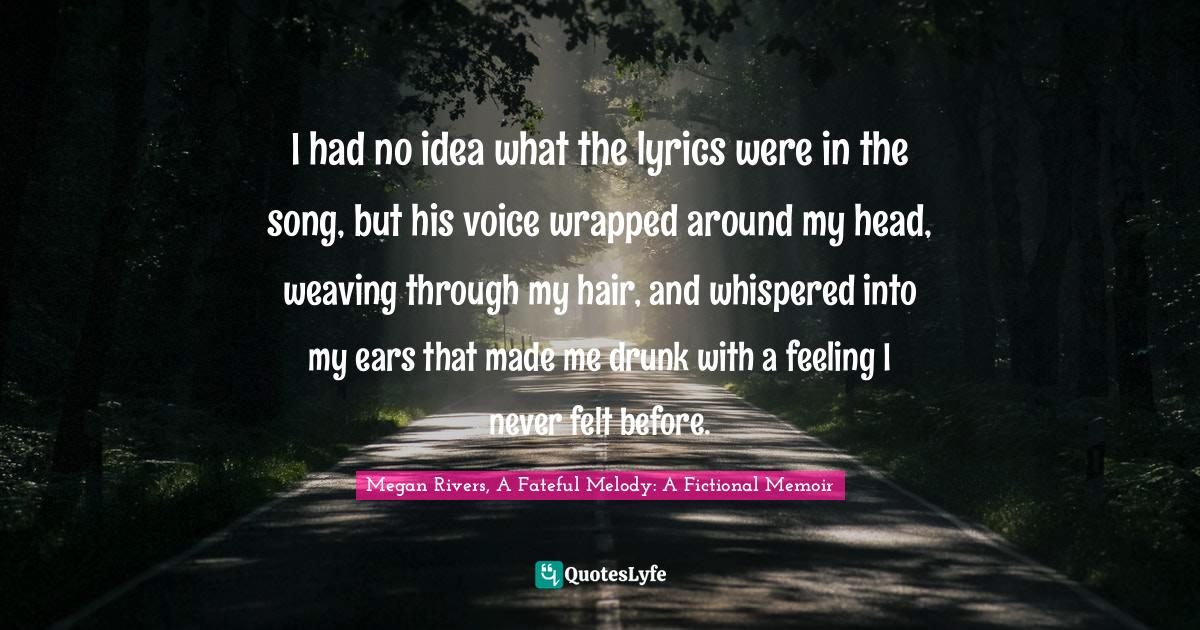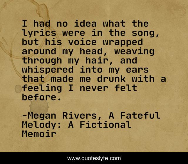 This page presents the quote "I had no idea what the lyrics were in the song, but his voice wrapped around my head, weaving through my hair, and whispered into my ears that made me drunk with a feeling I never felt before.". Author of this quote is Megan Rivers, A Fateful Melody: A Fictional Memoir. This quote is about new-adult-fiction, young-adult-romance, young-adult-fiction, music, new-adult-romance, megan-rivers,.