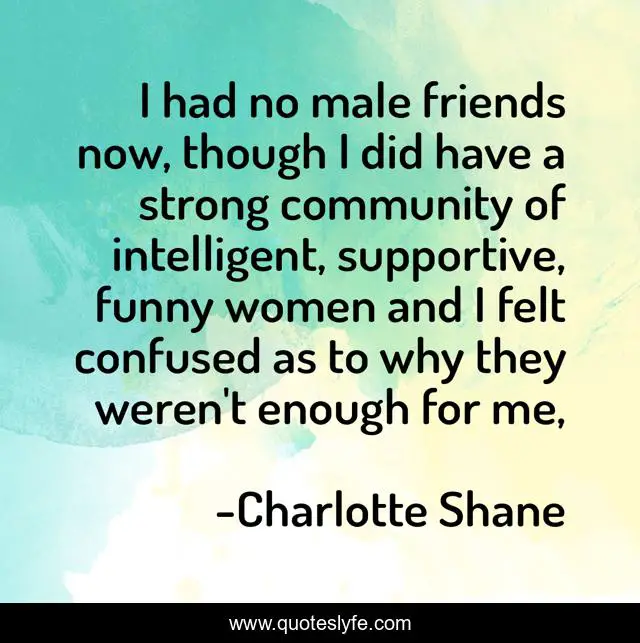 This page presents the quote "I had no male friends now, though I did have a strong community of intelligent, supportive, funny women and I felt confused as to why they weren't enough for me, ". Author of this quote is Charlotte Shane. .