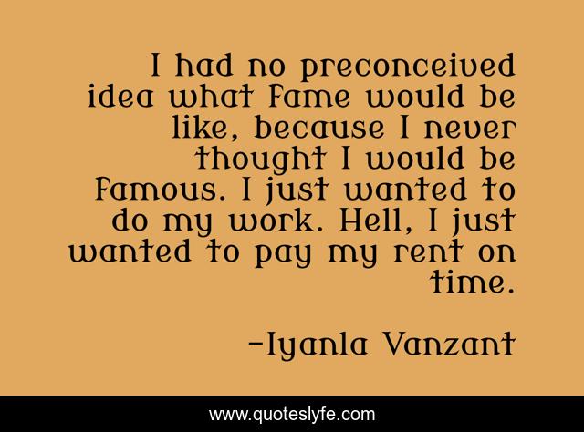 This page presents the quote "I had no preconceived idea what fame would be like, because I never thought I would be famous. I just wanted to do my work. Hell, I just wanted to pay my rent on time.". Author of this quote is Iyanla Vanzant. This quote is about thought, work, time,.