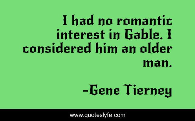 This page presents the quote "I had no romantic interest in Gable. I considered him an older man.". Author of this quote is Gene Tierney. This quote is about him, interest, man,.