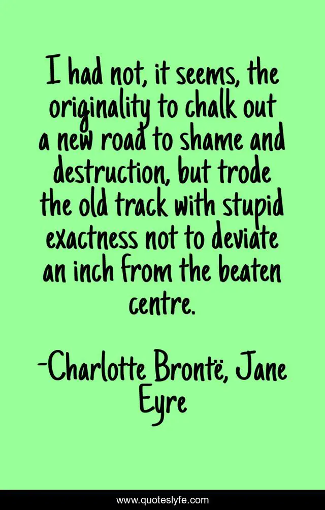 This page presents the quote "I had not, it seems, the originality to chalk out a new road to shame and destruction, but trode the old track with stupid exactness not to deviate an inch from the beaten centre.". Author of this quote is Charlotte Brontë, Jane Eyre. .