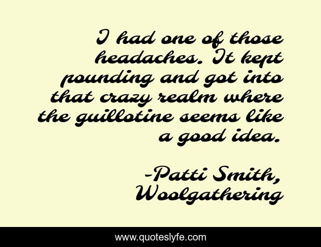 This page presents the quote "I had one of those headaches. It kept pounding and got into that crazy realm where the guillotine seems like a good idea.". Author of this quote is Patti Smith, Woolgathering. This quote is about illness, pain, headaches,.