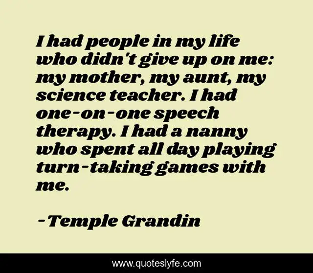 This page presents the quote "I had people in my life who didn't give up on me: my mother, my aunt, my science teacher. I had one-on-one speech therapy. I had a nanny who spent all day playing turn-taking games with me.". Author of this quote is Temple Grandin. This quote is about science, life, mother,.
